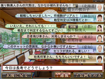 「談話室」では、くつろぎの雰囲気を大切にした、これまでにないチャットが実現されています。ゆったりとした会話の流れは、将棋ファンの情報交換の場としても、お楽しみ頂いております。
